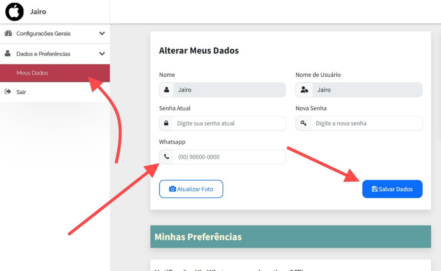 - Acesse Minhas Configurações → Dados e Preferências → Meus Dados.