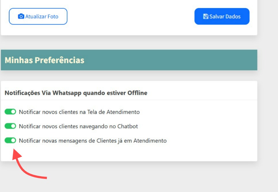 Ative: "Permitir que atendentes recebam notificações offline via WhatsApp" - Atendentes → Criar/Editar Atendente